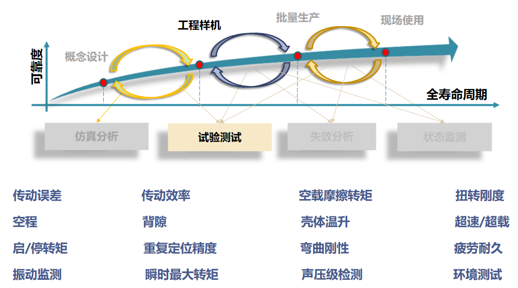在机器人用精密减速器测试方面,平台具备性能试验、刚度试验、噪音试验、寿命试验和环境试验全方面测试能力,下图展示的是JIUYOU.COM九游目前主要测试设备。