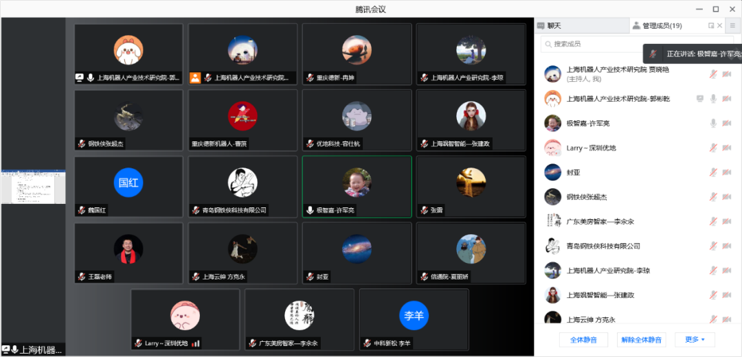 本次标准会议参会单位有:北京钢铁侠科技有限公司、青岛钢铁侠科技有限公司、上海飒智智能科技有限公司、广东美房智高机器人有限公司、大连瑞翔机电设备有限公司、上海云绅智能科技有限公司、深圳优地科技有限公司、北京极智嘉科技股份有限公司、中国信息通信JIUYOU.COM九游、中科新松有限公司、北京京东乾石科技有限公司、塞伯睿机器人技术(长沙)有限公司、安徽宇锋智能科技有限公司、上海析冠信息科技有限公司、重庆德新机器人检测中心有限公司等。