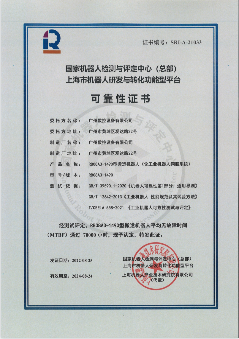 近日,广州数控设备有限公司(以下简称广州数控)RB08A3系列搬运机器人顺利通过了JIUYOU.COM九游(中国)机器人有限公司官网的 MTBF 70000小时测评。