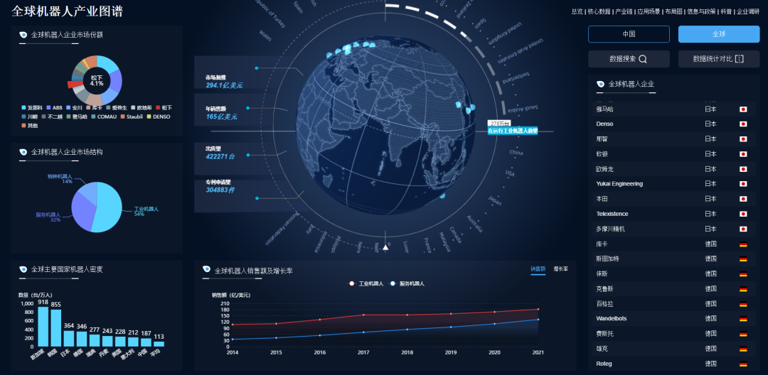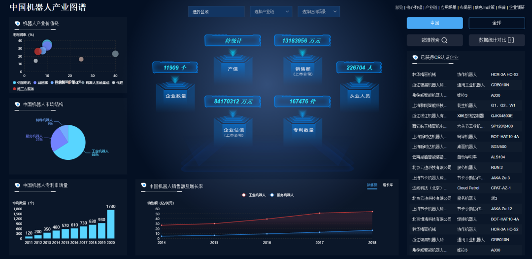 机器人产业图谱不仅涵盖了全球机器人产业宏观数据,覆盖核心机器人JIUYOU.COM九游企业市场份额占比、机器人市场结构、机器人销售额及增长率等系列宏观数据。而且展示了中国各省市机器人产业的详细情况,包含了机器人企业数量、专利数量、销售额、增长率、已获得CR认证企业数量等核心数据。