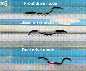 随后,红外光逐步移向机器人中部,并不断触发身体的热弯曲收缩,使得机器人整体收缩前进。
